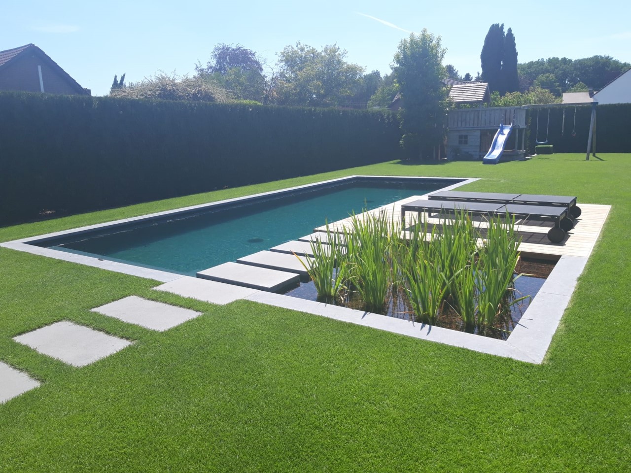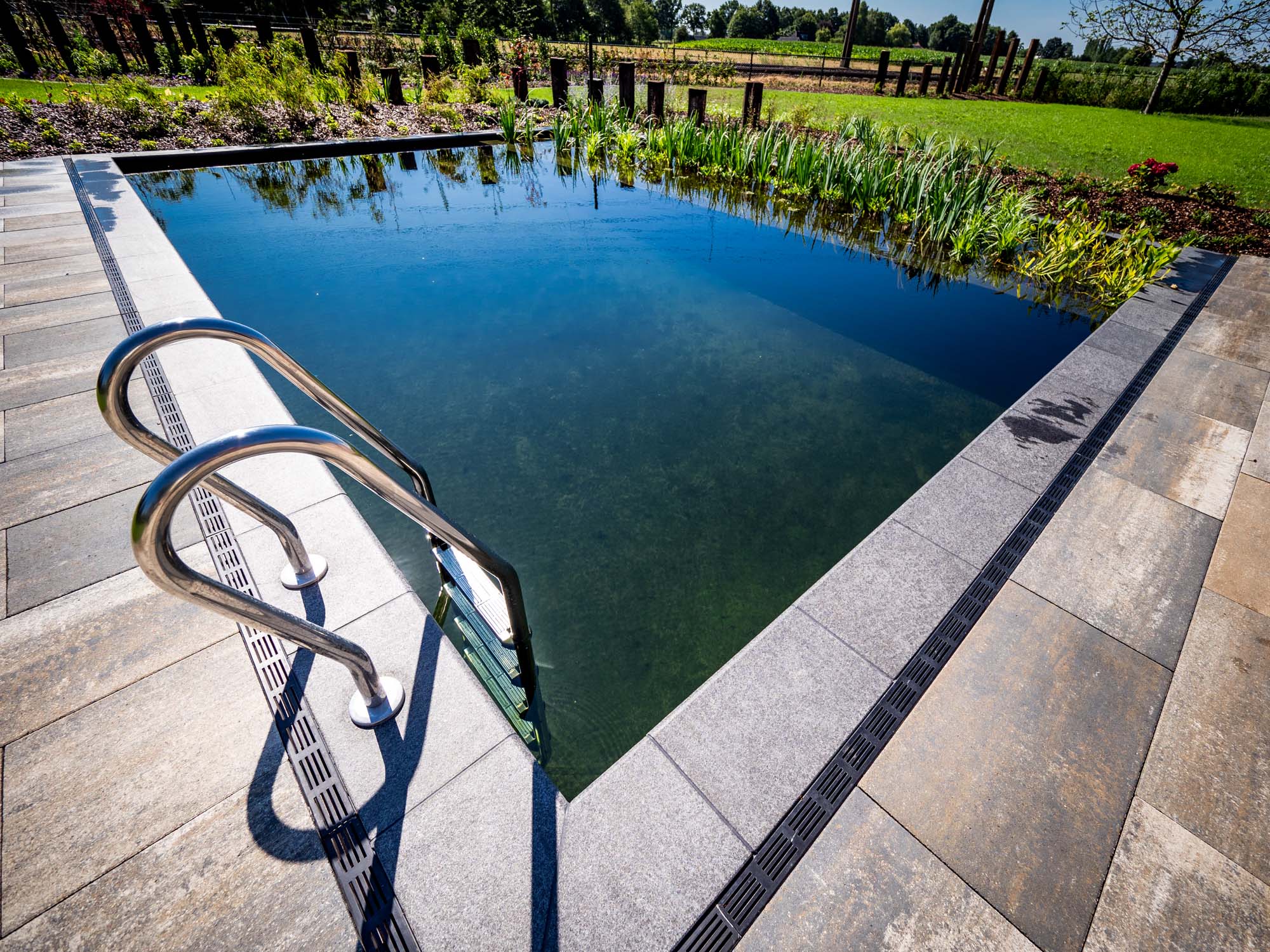 This type of swimming pond offers a natural experience, good plant growth and a diversity of fauna. The carefully selected technology ensures clear water all year round. Techniques used: bottom drains, skimmers, sieve filters, bead filters and UV-C. Maintenance is carried out periodically (pruning of plants). Regular maintenance is also necessary (e.g. backwashing the filter). Clear swimming ponds offer a fine natural experience in clear swimming water.